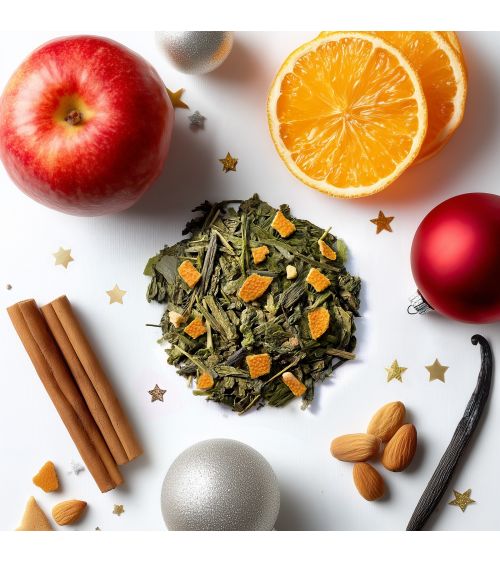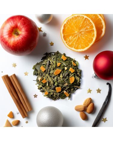 Ce thé vert de Chine parfumé à la pomme, orange, cannelle, amande, et vanille bourbon. Une belle alliance de fraicheur aux notes fruitées et doucement épicées, rappelant la chaleur de Noël.